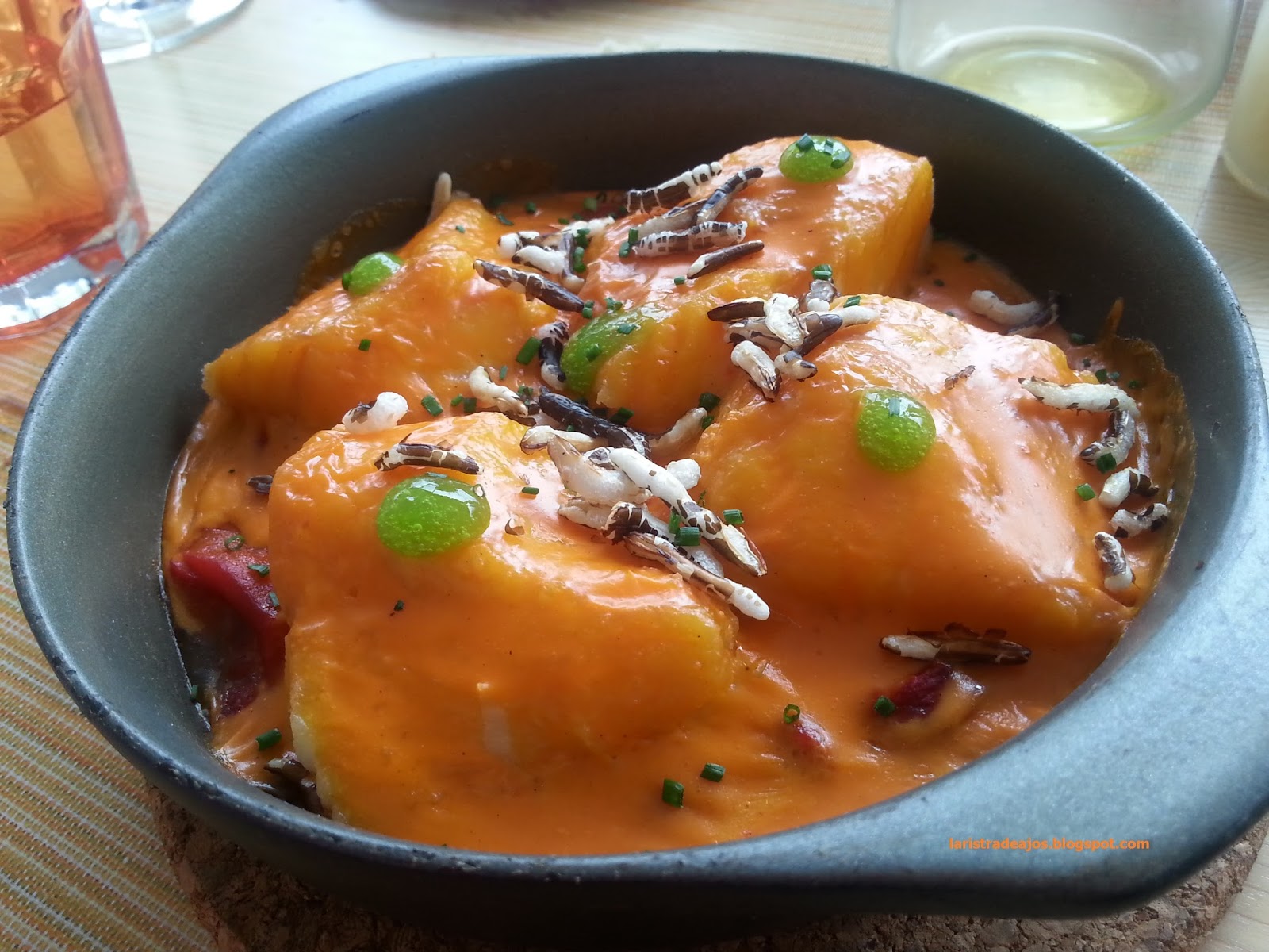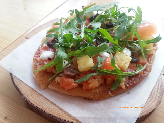 Para compartir comenzamos por una PizzaEnsaimada, sin levantar muchas pasiones en la mesa, sobresale el salmón por la calidad del producto. La concepción del plato es un homenaje a la gastronomía mallorquina utilizando la masa de la ensaimada como base de la pizza y conjugando dulce-salado tan característico de la gastronomía balear.