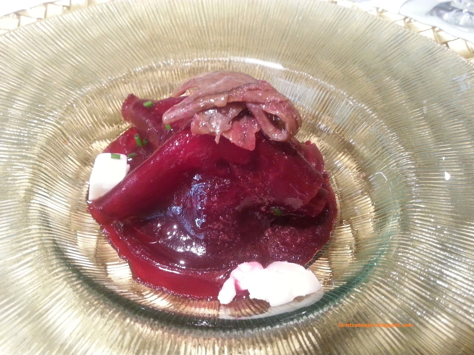 Cambiamos de vino y plato. Milhojas de remolacha con queso Laguna de Miraflores (Sierra de Madrid) y anchoa. Sin ser muy amante de la remolacha debo admitir que el plato es redondo, el queso aporta el sabor y textura perfecta que se complementa con el resto del plato. El queso potente, lleno de sabor da un toque muy elegante.