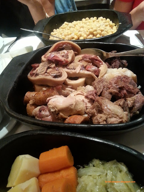 Y por último la bandeja de carne en la que hay de todo: pollo, morcillo, jamón , tocino, morcilla… y tuétanos. Ana Hernández me regala en mi plato el más grande y se lo agradezco, soy una apasionada del tuétano. El chorizo se deshace y toda la carne está en su punto de cocción también. Una delicia.