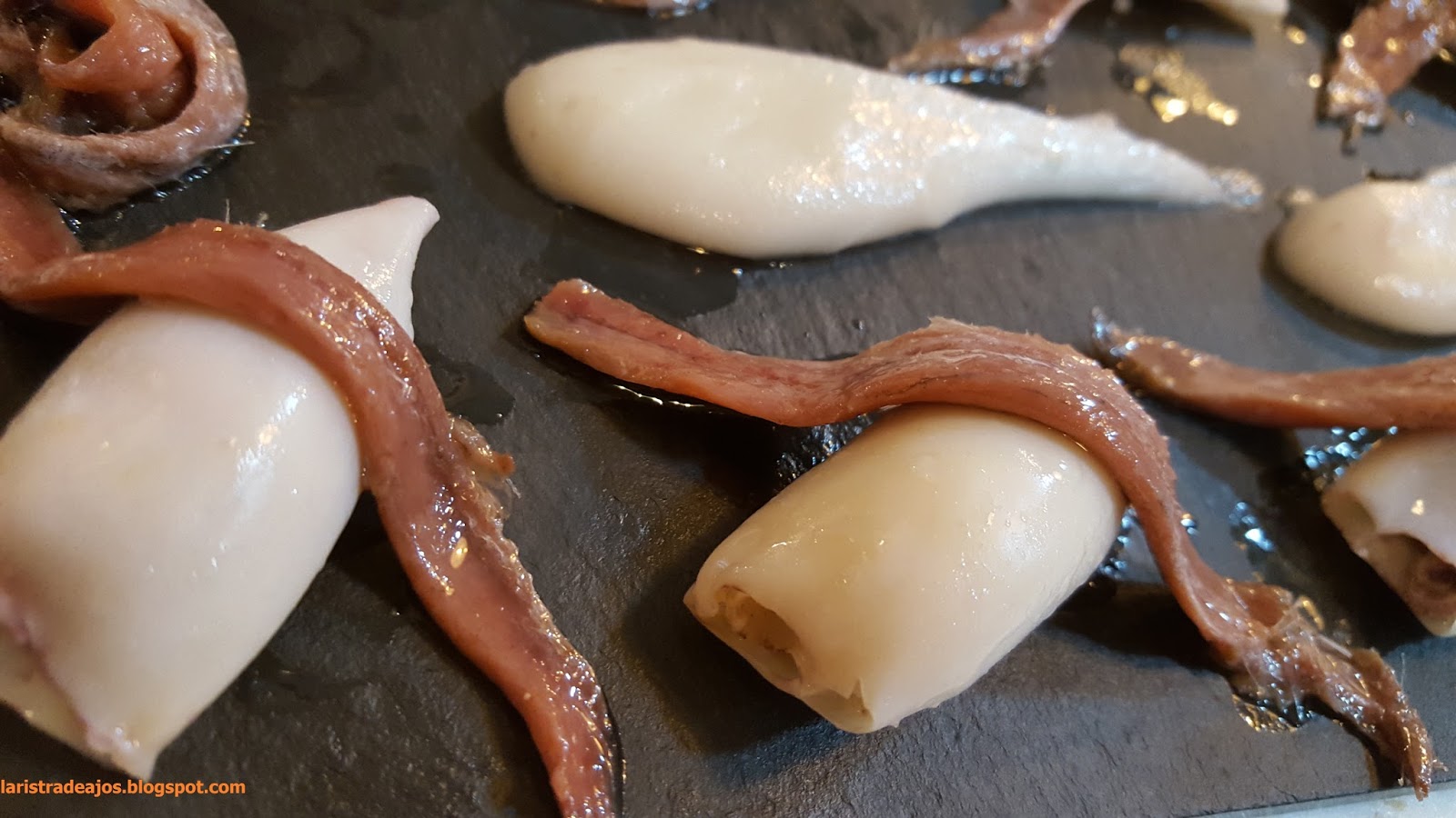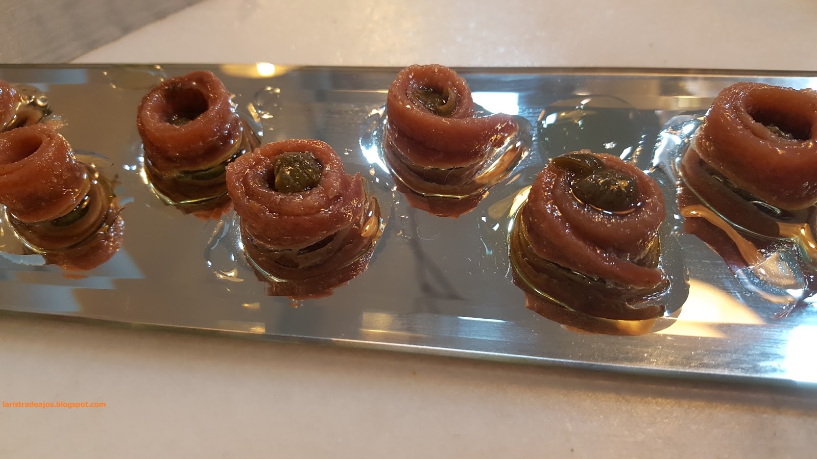 No dejamos de divertirnos y de ello se encargan Ángel y su socio José (falta hoy Sonsoles) y nos sorprende con “La noche que la alcaparra salió de juerga”, unas anchoas que envuelven  literalmente a una alcaparra y que en boca es sencillamente redondo.