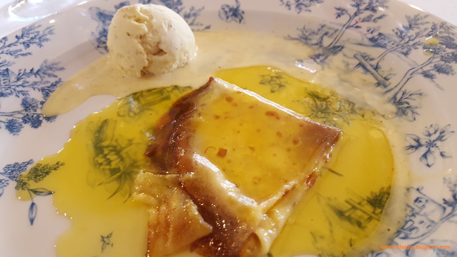 Para finalizar la comida Creppes Suzette que se preparan en la mesa. Maravillosa la mezcla de mantequilla, azúcar, zumo de naranja y triple seco. El flambeado y el espectáculo está servido. Sin duda es el postre que hay que pedir para terminar la comida.