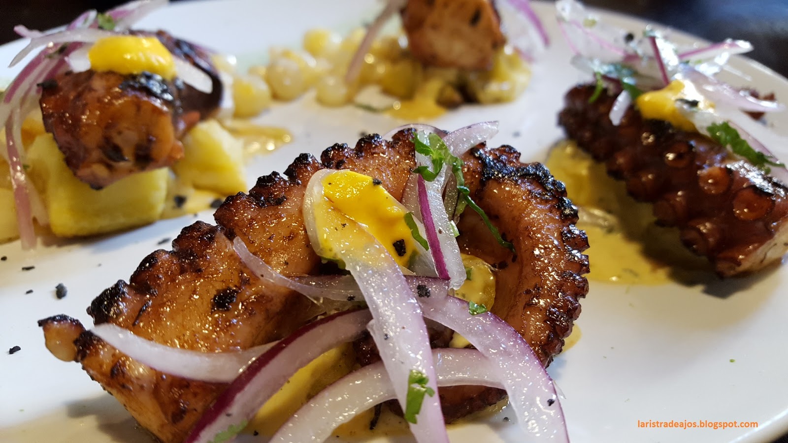Antes de llegar aquí es casi obligatorio comenzar el menú con una causa limeña y su pertinente Pisco sour. Una manera distinta de presentarlo, pero resultona y atractiva.