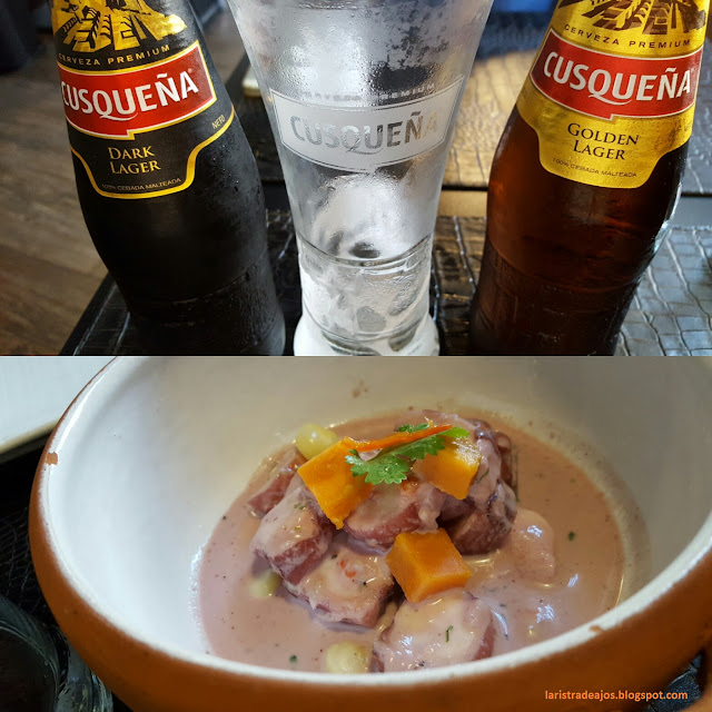 Tras probar otro pisco (maricucha) nos pasamos a la cerveza del país, Cusqueña, que nos servirá de hilo conductor durante el resto del menú. Catamos las tres de las cuatro que tiene en el mercado (dorada, roja y negra).